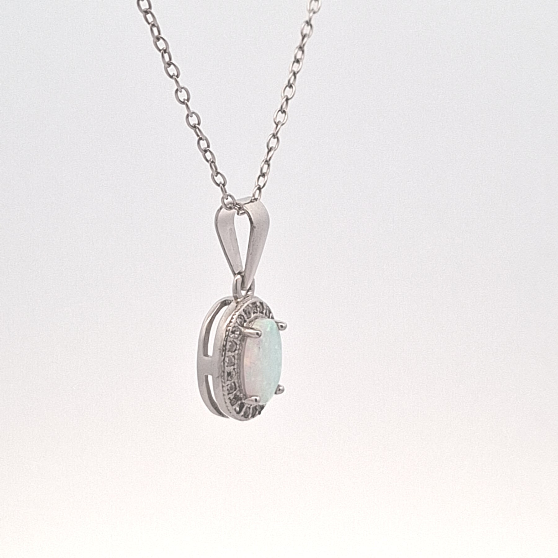 Sterling silver oval cabochon synthetic Opal Halo cluster presented on 18"/46cm chain
