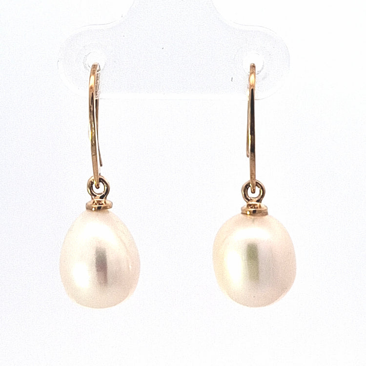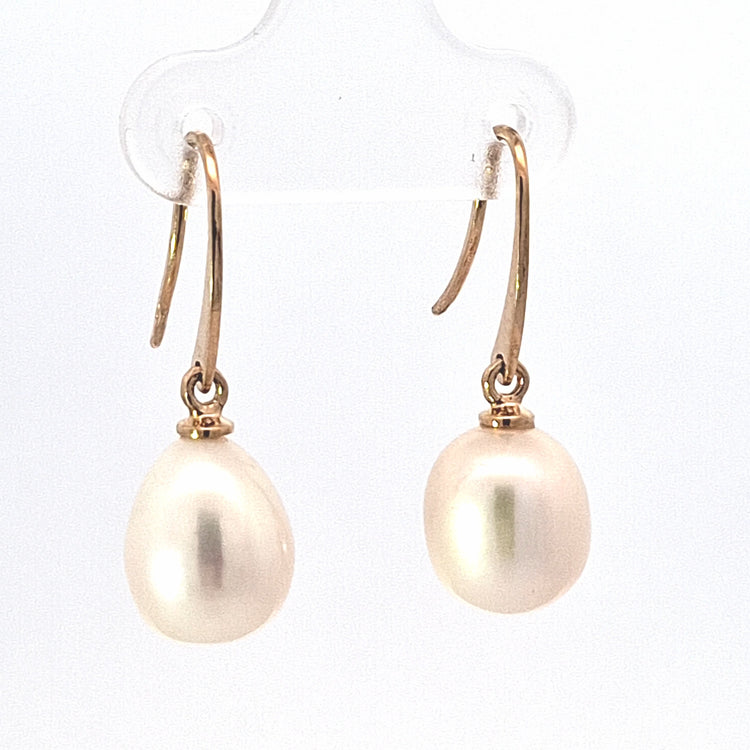 Elegant 9ct gold shepherd's hook earrings featuring organic drop-shaped freshwater cultured pearls. Each pearl showcases a natural lustre and subtle iridescence, creating a timeless piece perfect for everyday wear or special occasions. The secure hook fastening ensures comfort and reliability. A versatile addition to any jewellery collection.