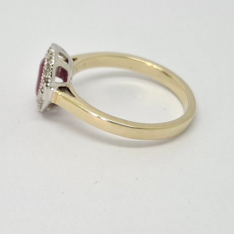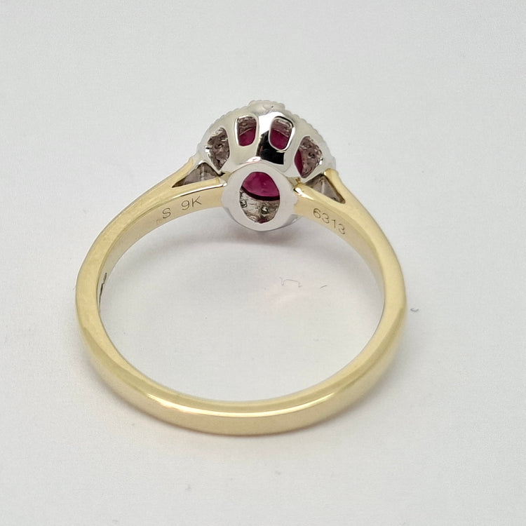Discover refined sophistication with this stunning 9ct gold halo cluster ring, showcasing a captivating oval ruby as its focal point. The genuine ruby, measuring 7x5mm and weighing approximately 0.80 carats, displays the deep crimson richness characteristic of fine rubies. Expertly set using the rub-over technique, the stone is secured within an elegant millegrain bezel that adds vintage-inspired detail and enhances its presence. Encircling this precious centrepiece is a carefully arranged halo of natural diamonds totalling 0.08 carats, their sparkle creating a luminous frame that amplifies the ruby's inherent fire and depth. The outer millegrain bezel adds another layer of craftsmanship, creating a sophisticated three-dimensional effect. Grain-set diamonds ensure secure placement whilst maintaining the ring's graceful proportions. Crafted in durable 9ct gold, this piece represents exceptional artisanal jewellery-making. Ideal for those seeking an alternative to traditional diamond rings or a distinctive statement piece, this ruby halo ring combines timeless elegance with genuine gemstone beauty that will be treasured for a lifetime.