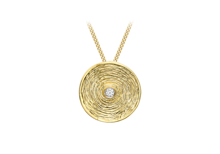9ct gold Jute organic pattern pendant with round faceted CZ at centre on diamond cut curb link chain 16"/41cm-18"/46cm adjustable.