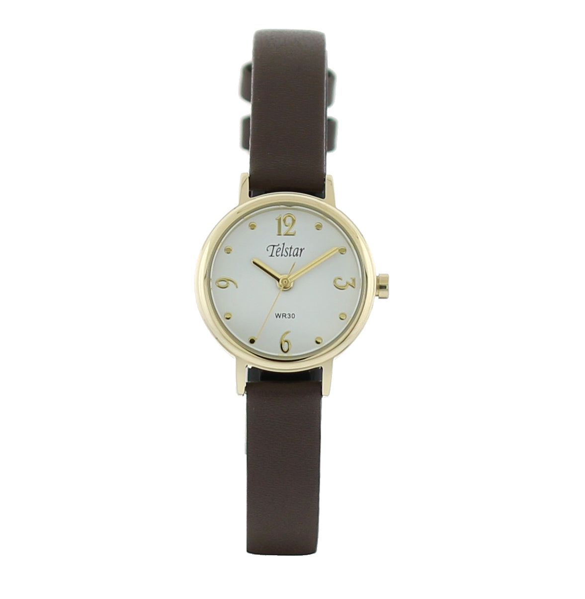 Telstar W1096 LYW strapped ladies gold plated watch with a small footprint of 24mm diameter case makes it neat on the wrist. 30m water resistant, brown strap. 5 year guarantee