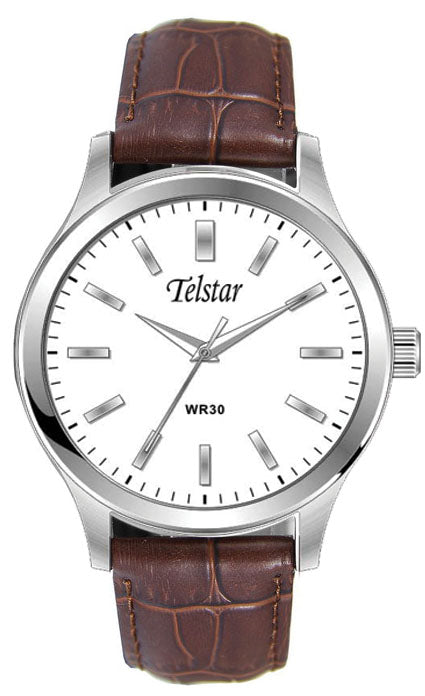 Gents Telstar quartz classic wristwatch, white dial on brown strap. 30m WATER RESISTANT 33877