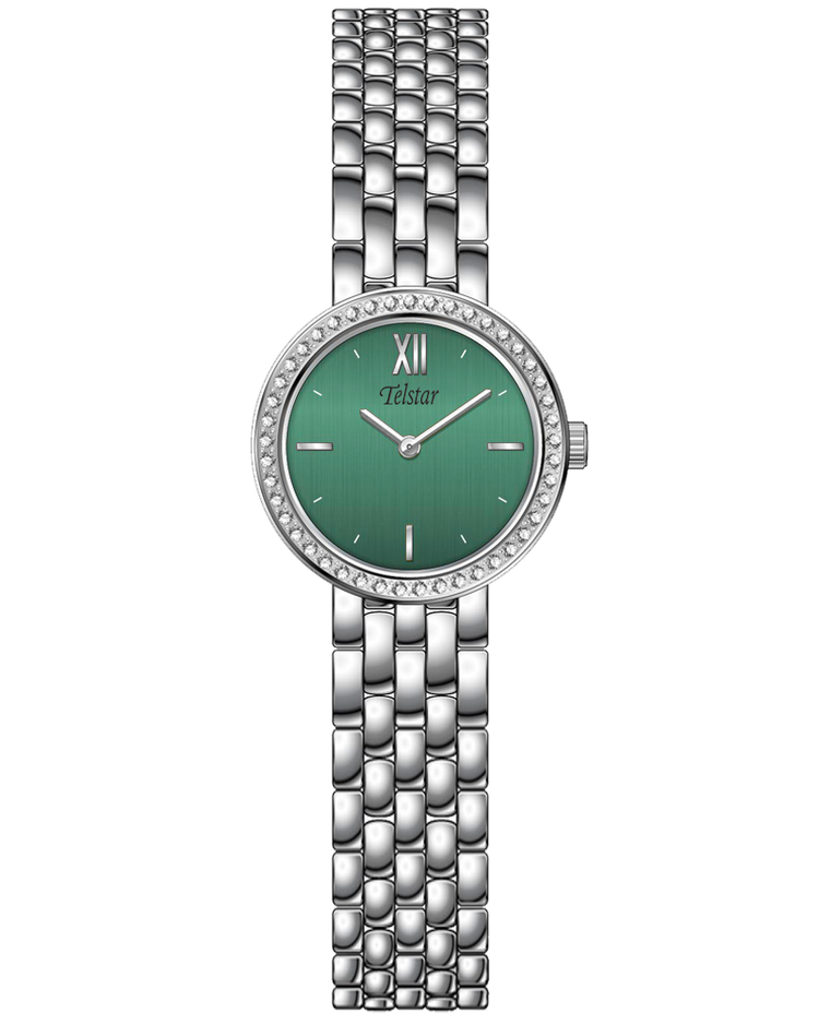 Telstar quartz Paris petit round silver tone case and bracelet lady's watch with Green dial and crystal set bezel