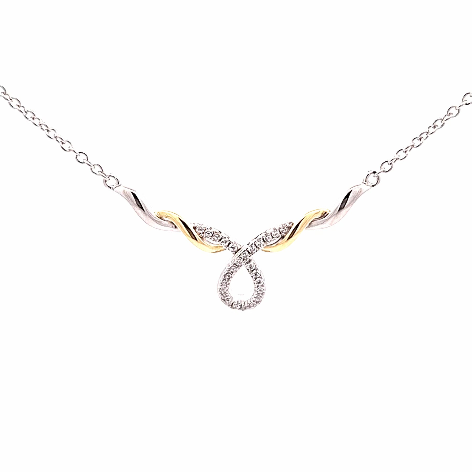 Sterling Silver pendant with Gold tone highlights featuring an entwined open work Pear drop bar style pendant on adjustable 17"/43cm-18"/46cm chain