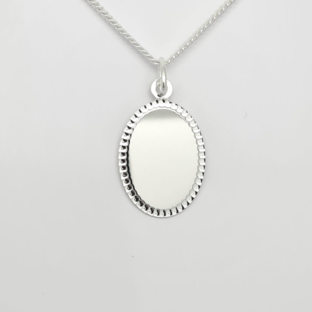 14mm x 19mm oval polished disc with milled edging on 18"/46cm Diamond cut curb link chain - engraving option available.