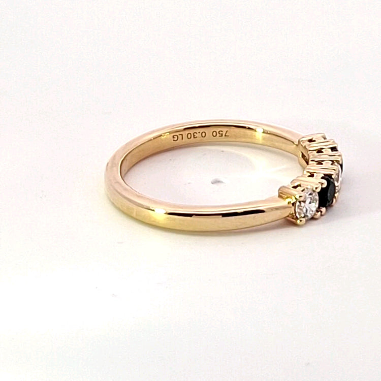 This 18ct gold 5 stone eternity ring features a claw setting and 3 lab-grown diamonds with a total carat weight of 0.30 carats, as well as 2 lab-grown sapphires with a total carat weight of 0.36 carats. Each stone is precisely chosen to create a stunning and balanced design, showcasing beautiful lab-grown diamonds and sapphires.