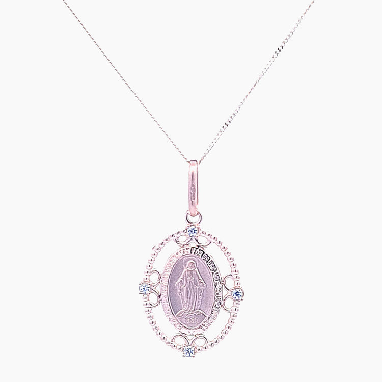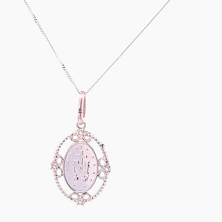 Crafted from 9ct yellow gold, this 15.5mm x 28.5mm oval pendant features intricate filigree design and sparkling CZ details. Showcasing the Miraculous medal, this pendant adds a touch of elegance to any outfit. Perfect for daily wear or special occasions. On 18"/46cm curb chain.