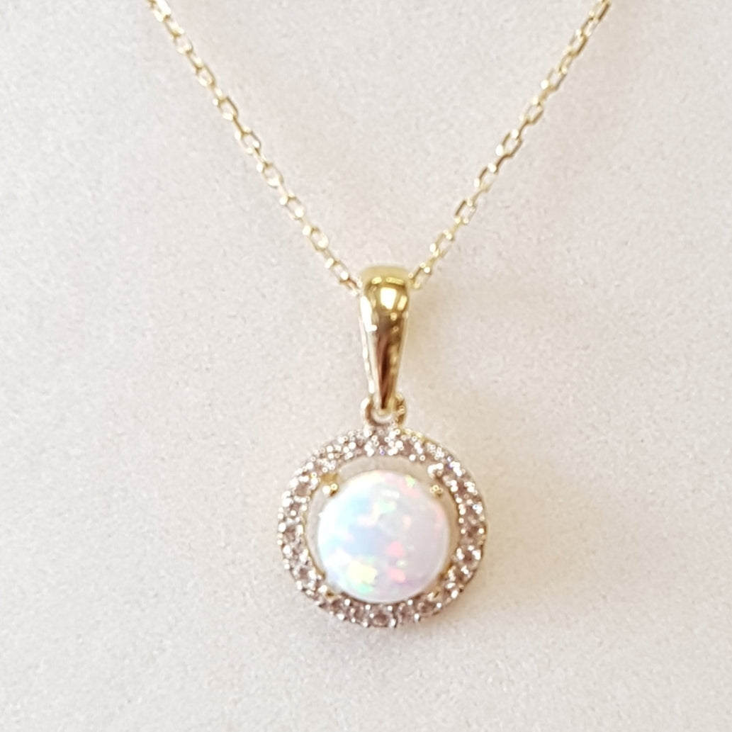 9ct gold halo cluster set with CZ and synthetic Opal on 18" diamond cut trace chain
