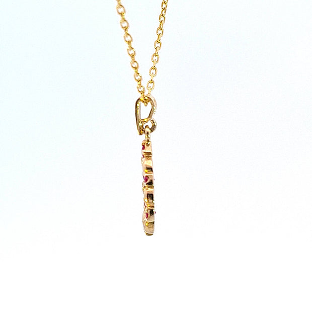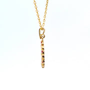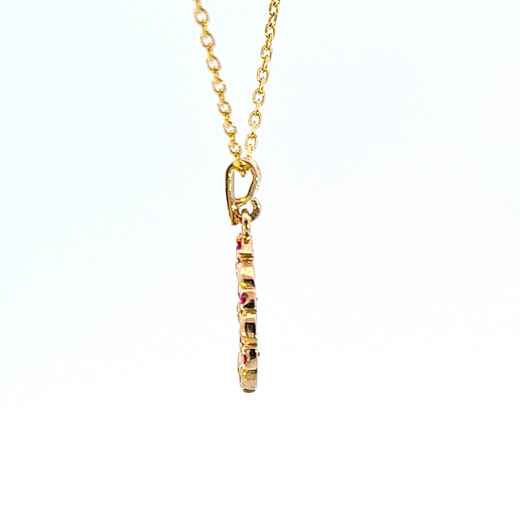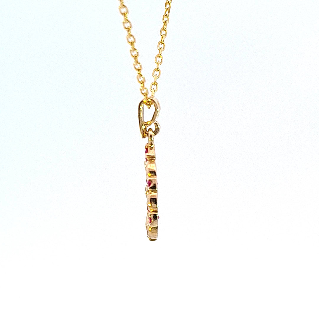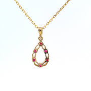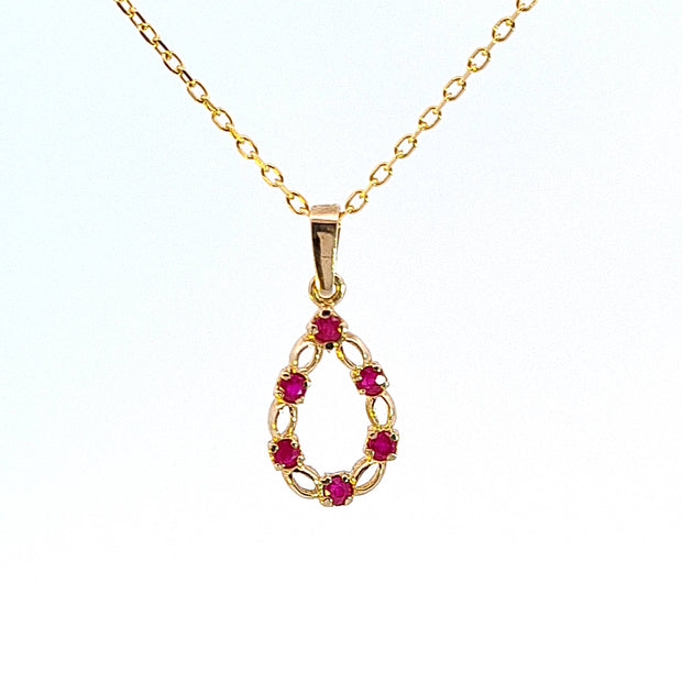 Expertly handcrafted in Birmingham, this 9ct gold pendant features a stunning open pear drop design adorned with alternating rubies and oval panels. The 6 rubies and 6 oval panels add a touch of elegance to this piece. Complete with a 9ct gold diamond cut chain and bolt ring catch for a secure fit. 9ct gold Diamond cut 18"/46cm chain. Diameter 1.50mm. 6mm bolt ring catch.