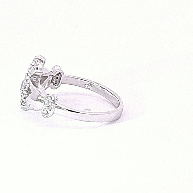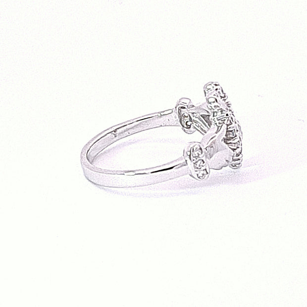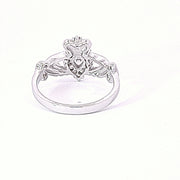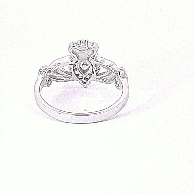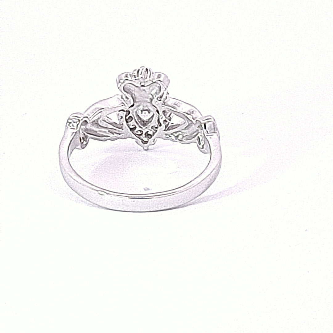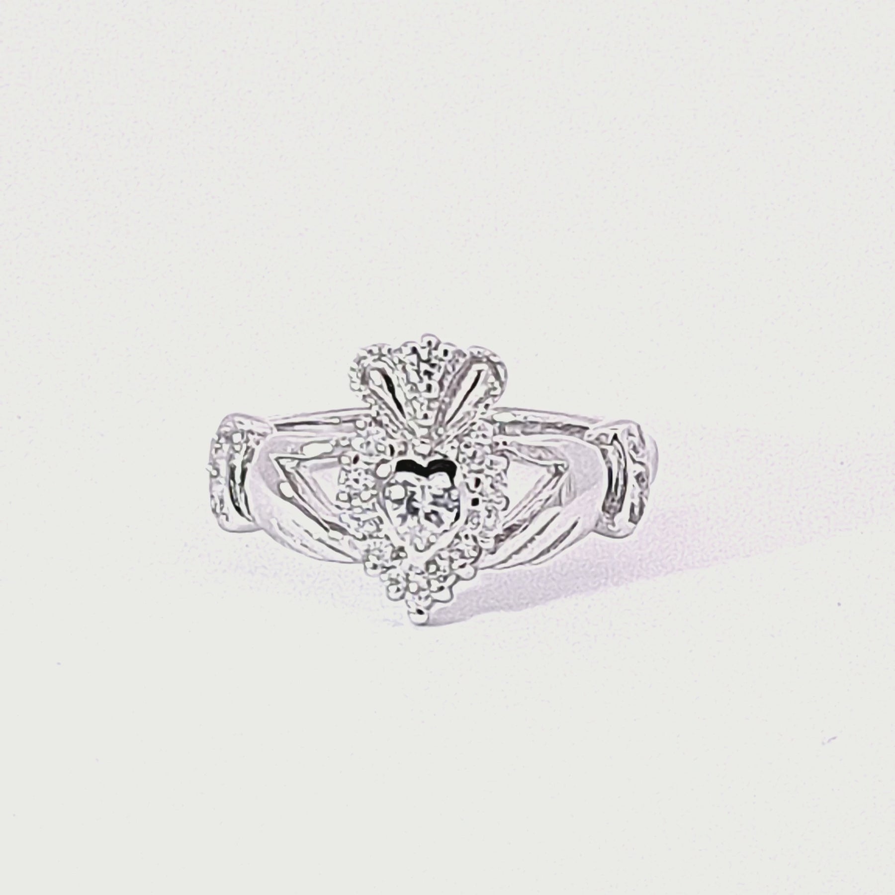This Claddagh CZ Cluster ring 36197 is a stunning piece of jewelry made from high-quality sterling silver. The center cluster of Cubic Zirconia stones is surrounded by a classic Claddagh design, adding a touch of tradition and elegance. Expertly crafted with CZ shoulder set stones, this ring is a perfect choice for those who appreciate both beauty and quality. Add it to your collection and enjoy its timeless beauty for years to come.