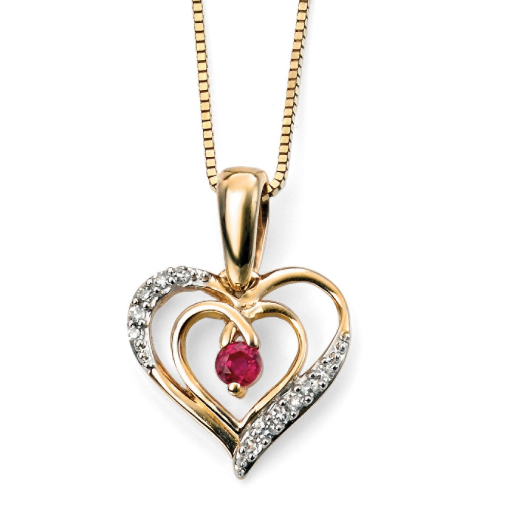 A timeless classic, this heart pendant features beautiful diamonds and a central ruby stone. Crafted in 9ct yellow gold, this piece is made to last a lifetime and could be passed down for generations to come.