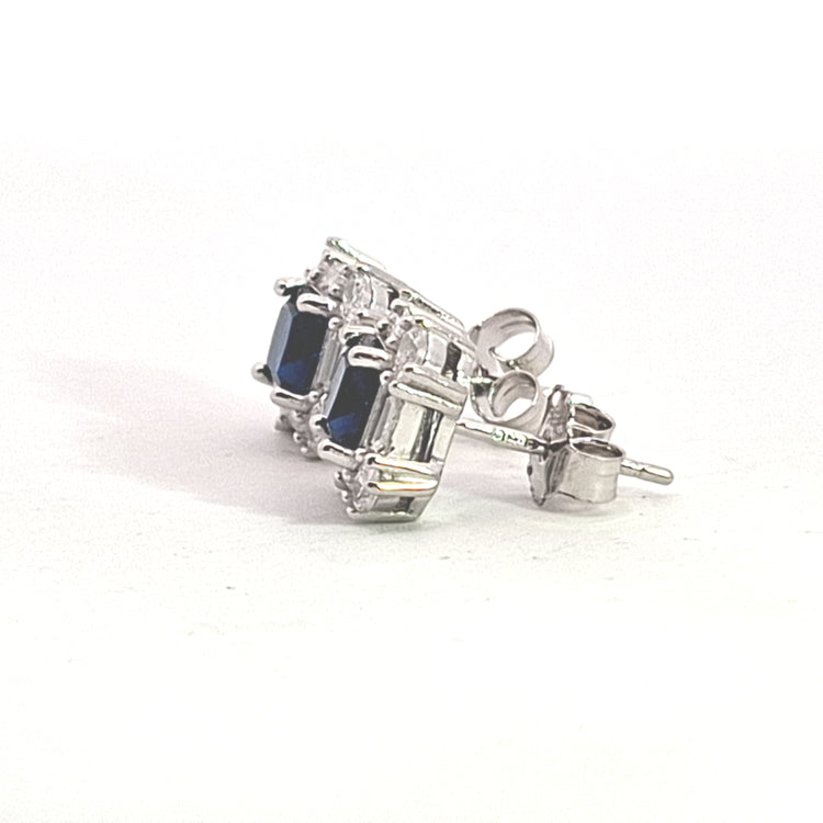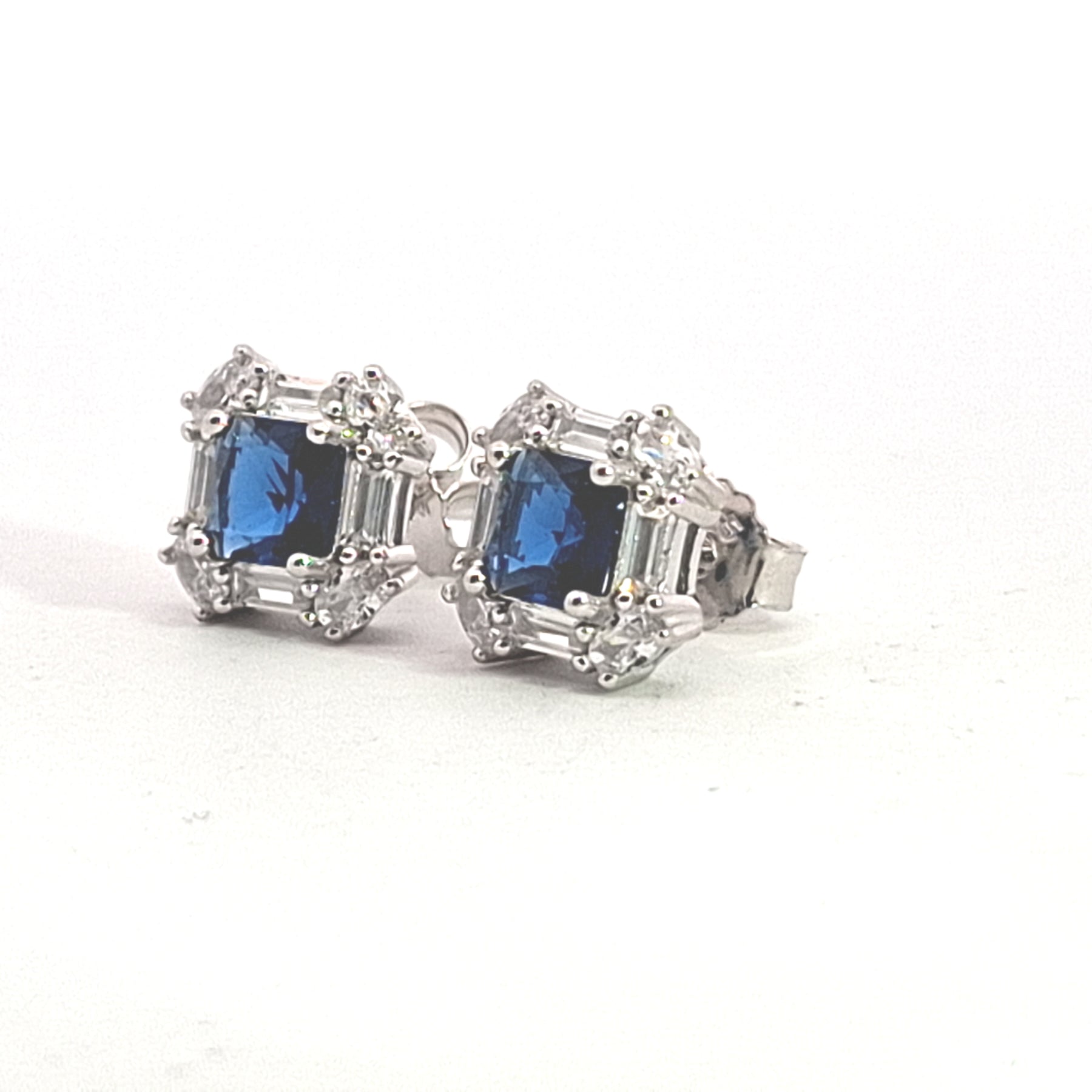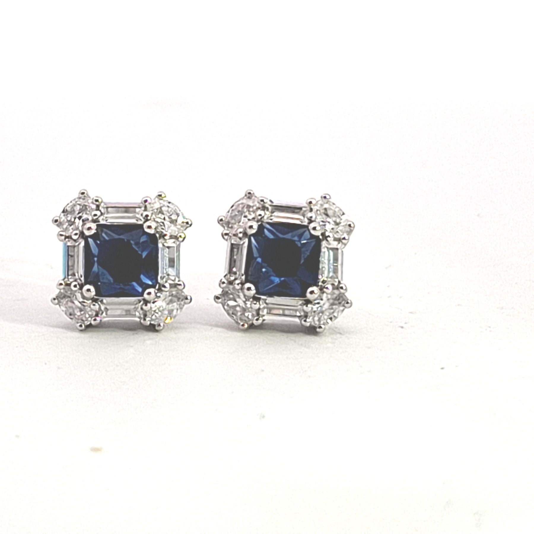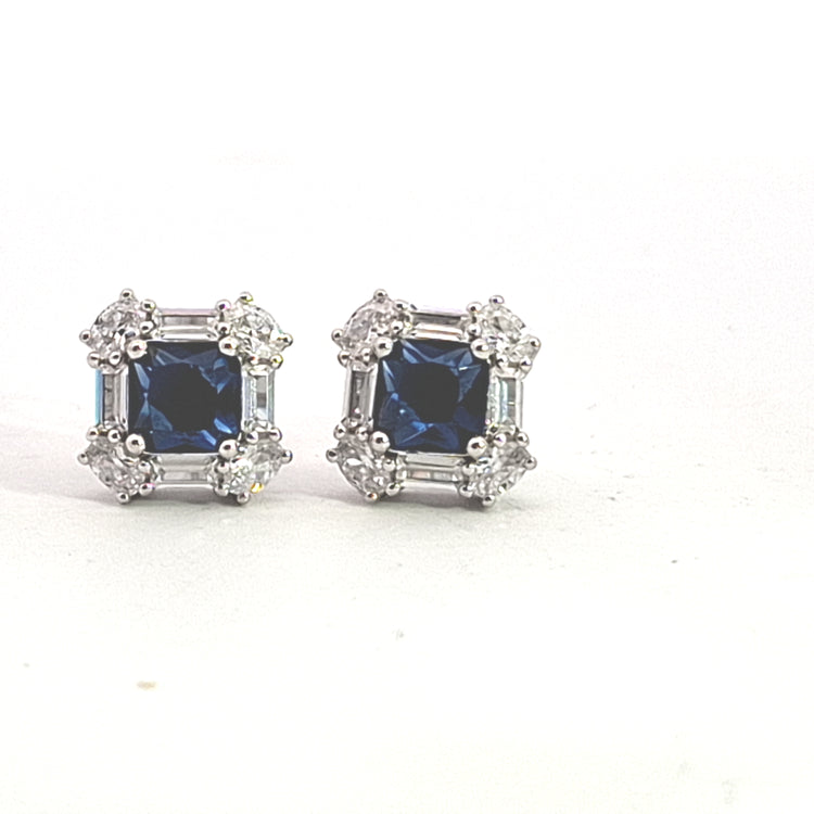 Sterling silver square shape stud earrings set with Sapphire Blue CZ with Baguette surround and round CZ at corners