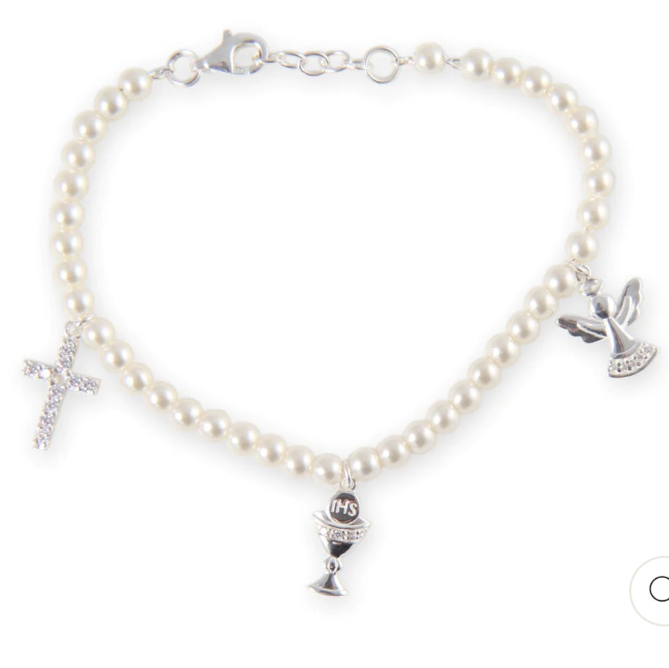 Communion Chalice pearl bracelet, adjustable girls length. Silver plated.