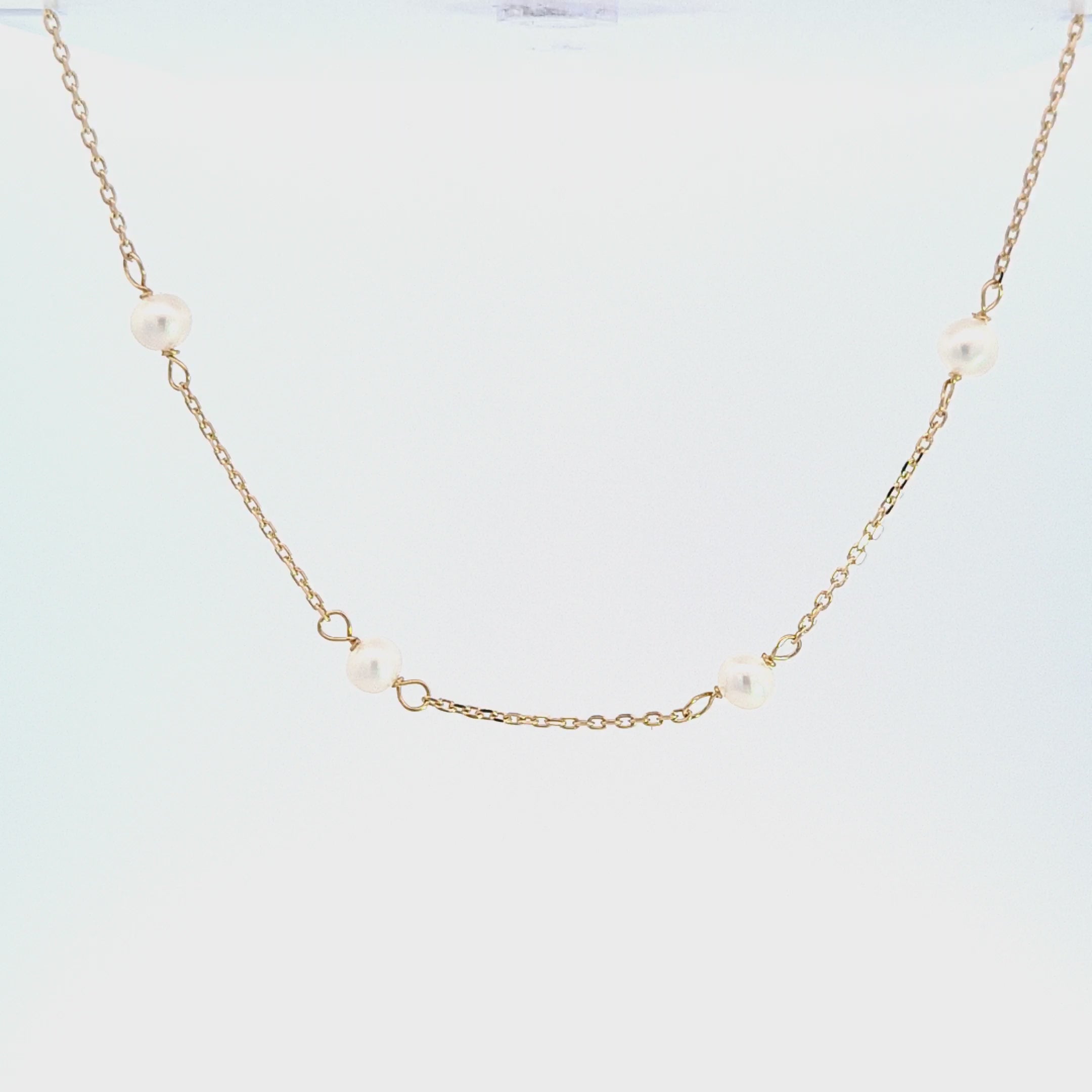 9ct gold chain with 4mm Cultured pearls spaced along length. 17"/43cm length. Bolt ring catch