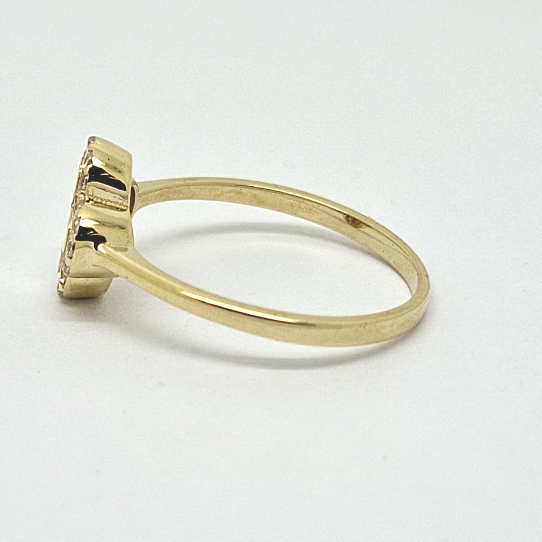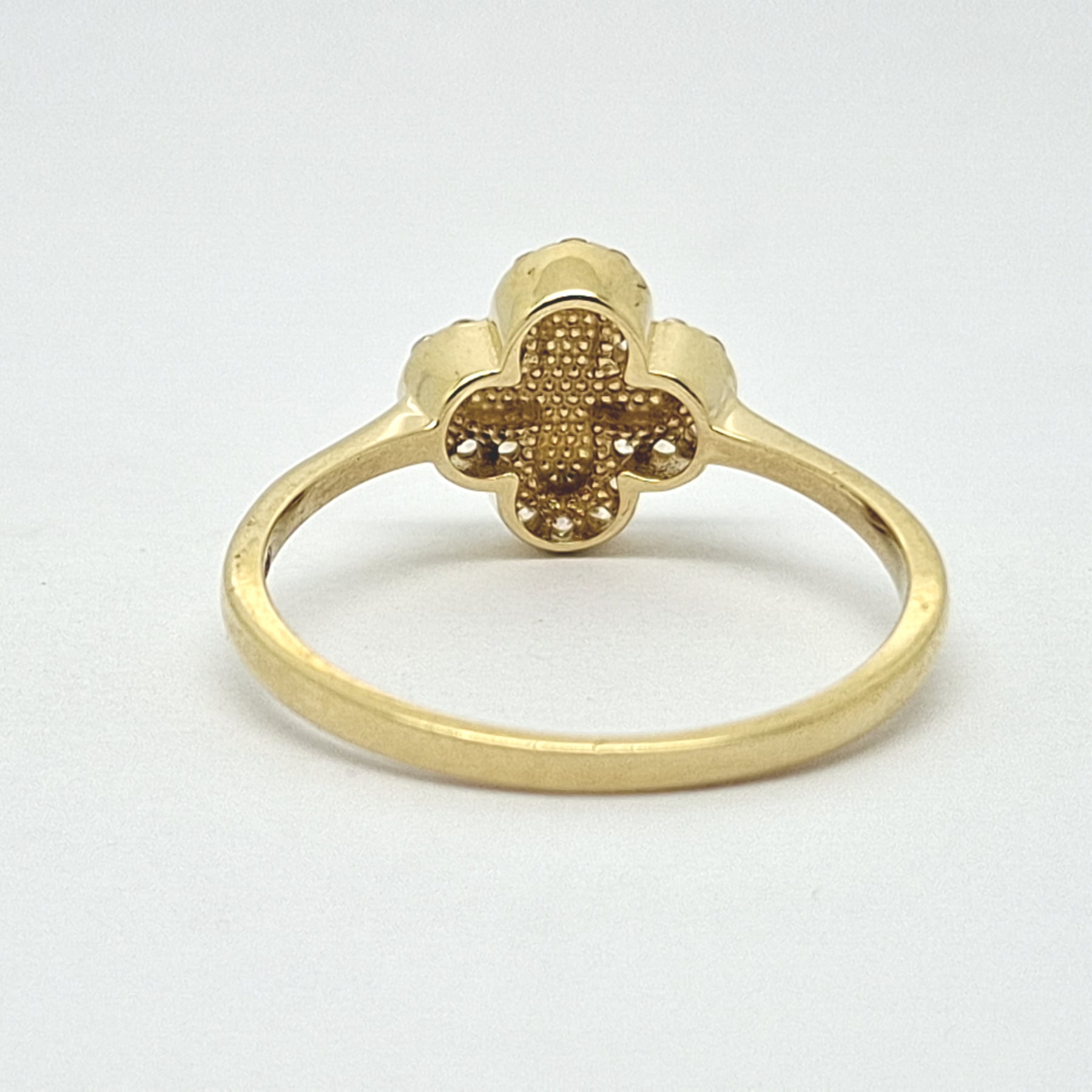 This charming 9ct gold dress ring features a distinctive clover motif that combines whimsy with sophisticated craftsmanship. The polished clover design creates an elegant focal point, whilst a delicate micro claw-set cubic zirconia surround adds sparkle and refinement to the piece. The micro claw setting technique ensures each stone is individually secured with precision, maximising brilliance without compromising the clover's graceful silhouette. The polished finish of the clover contrasts beautifully with the sparkling surround, creating visual depth and dimension. Crafted in quality 9ct gold, the ring offers excellent durability and comfortable wearability for both special occasions and everyday elegance. The clover design carries symbolic meaning associated with luck and good fortune, making this ring particularly meaningful as a gift or personal talisman. Cubic zirconia provides exceptional clarity and sparkle comparable to diamonds, offering outstanding value and practical durability. This dress ring is ideal for those seeking a distinctive piece with character and charm, perfect for adding personality to any jewellery collection. The timeless clover motif transcends trends, ensuring this ring remains a cherished accessory for years to come.