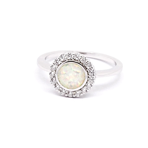 Experience the mesmerizing beauty of our Round Cabochon Created Opal Cluster Ring. With illuminating flashes of red and green, this opal is set in a unique rub over setting surrounded by micro pave CZ stones. The flat top appearance and elegant side cut-outs add a touch of sophistication. Crafted in Sterling Silver with a rhodium finish.