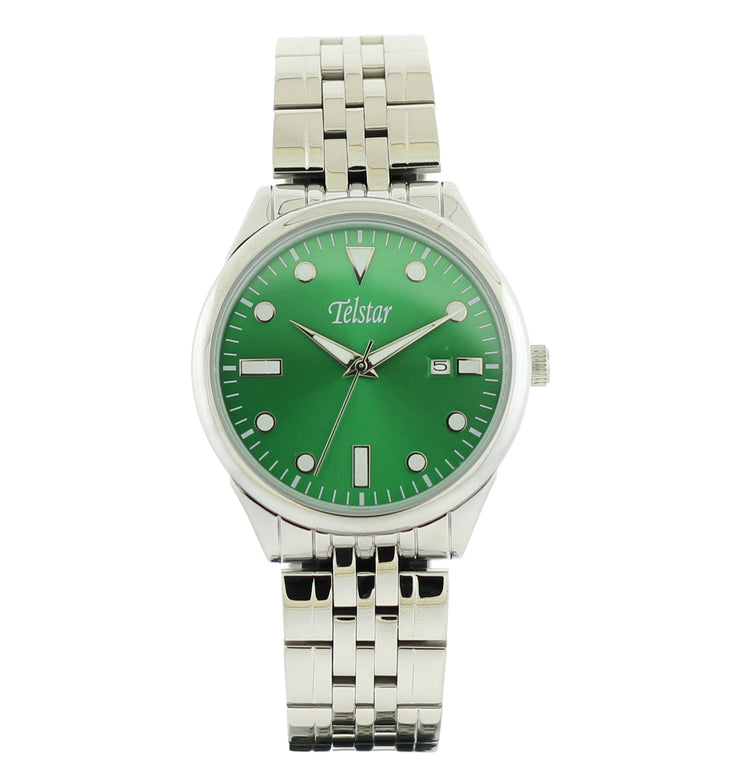 Telstar Quartz Buda gents green dial watch steel, model m1070 bsn, bracelet model with butterfly catch